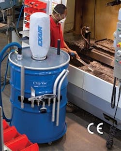 The 110 gal Chip Vac system is a fast and easy way to clean chips, or other dry materials, from fixtures, floors and work surfaces of machining centers, lathes, saws, mills and other industrial equipment. The Chip Vac is compressed air-powered and attaches to the included drum. It is extremely quiet at 77 dBA, making it suitable for a wide variety of applications.